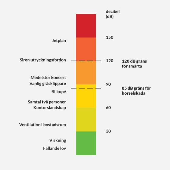 Vetenskapliga undersökningar visar att det mänskliga örat kan ta skada av ljud från 85 dB och uppåt, beroende på vilken form av ljud det är. Tänk därför på att alltid använda någon form av hörselskydd, såsom öronproppar, hörselkåpor eller annat dämpande skydd i de miljöer där du misstänker att ljudnivån överstiger 85 – 90 dB.