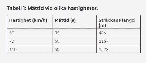 Mättiden vid olika hastigheter och den aktuella sträckans längd redovisas i Tabell 1 bredvid.